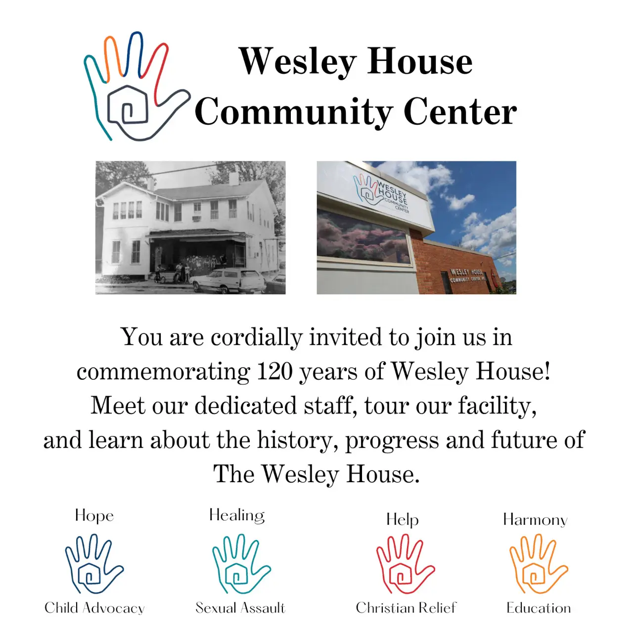 You are cordially invited to join the Wesley House Community Center staff in commemorating 120 years of service. Meet the dedicated staff, tour the facility, and learn about the history, progress, and future of The Wesley House.
