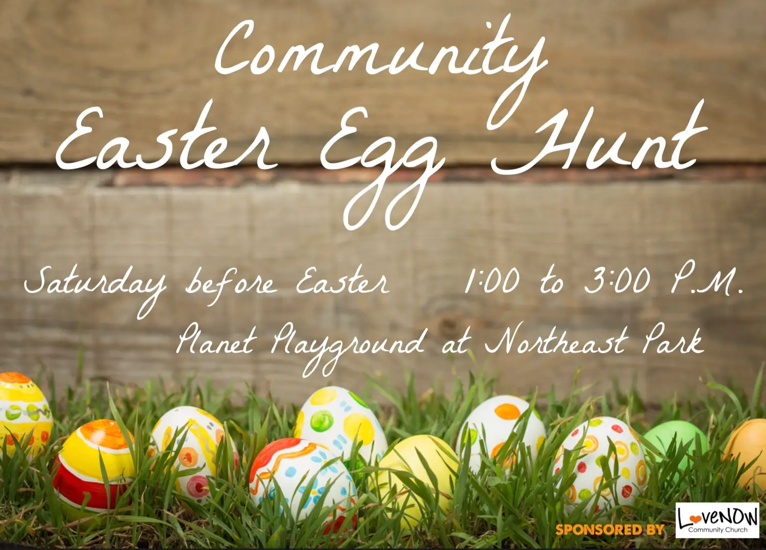 http://lovenow.org/easterWe are looking forward to being able to serve and bless our community with a FREE Easter Egg Hunt at Northeast Park’s Jeannie’s Place (formerly Planet Playground). There will be games, activities, lunch, and – of course – candy!