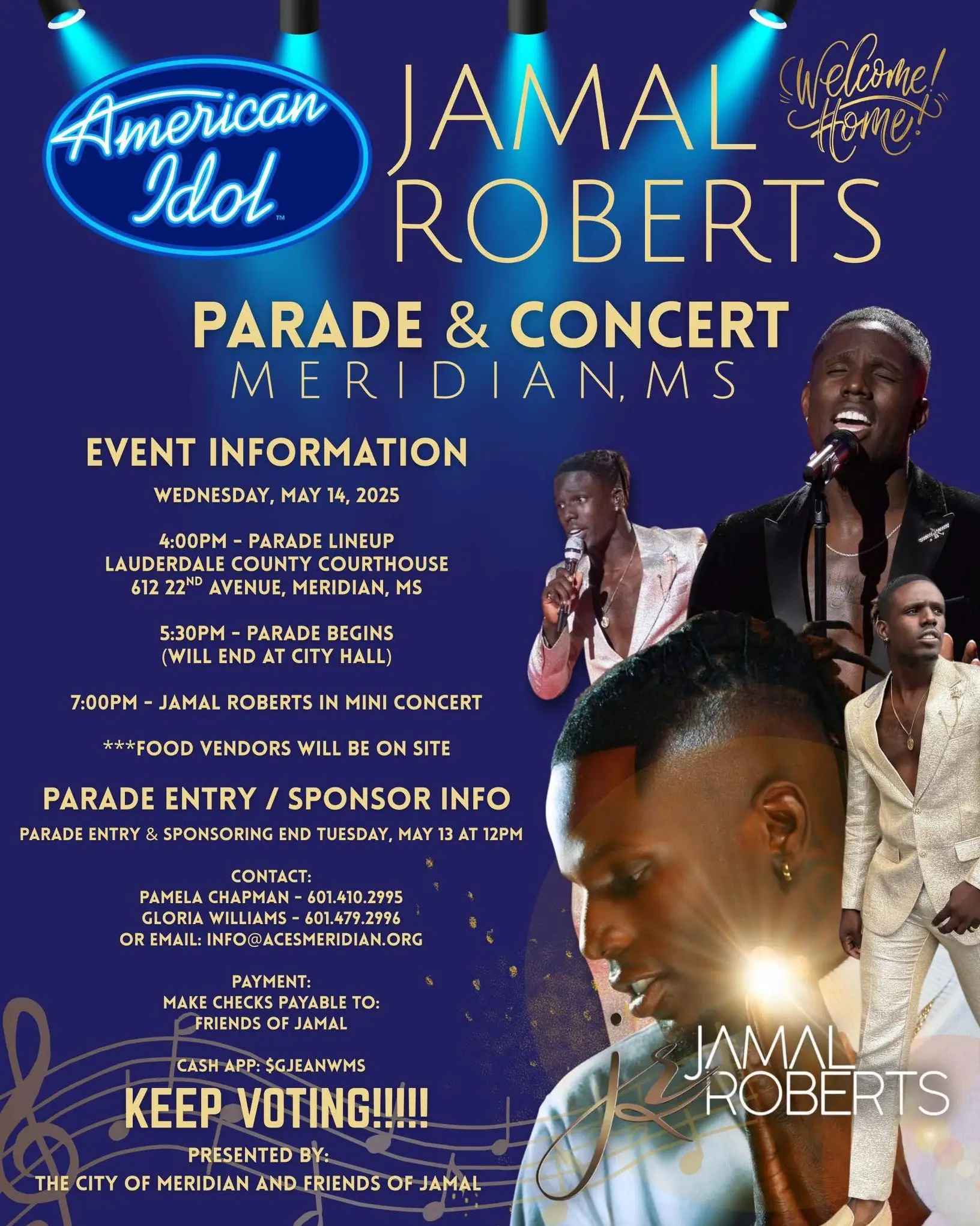 Meridian’s own Jamal Roberts has made it into the Top 3 on American Idol. Join us downtown for a “Welcome Home” parade and concert to be filmed for the show.