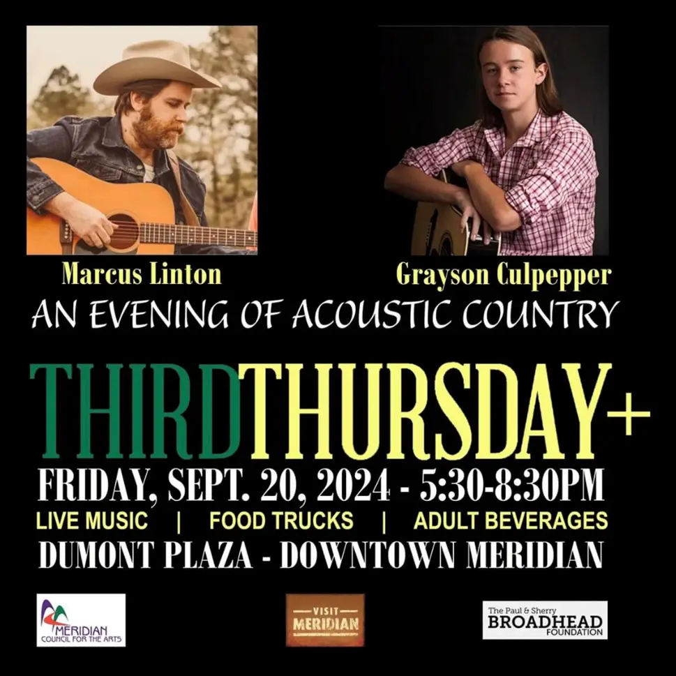 Marcus Linton and Grayson Culpepper will each perform during “An Evening of Acoustic Country Music” at Dumont Plaza, Downtown Meridian for THIRD THURSDAY+ on Friday, Sept. 20. These fine local artists are well-known for their amazing talent and the ability to keep you entertained. Come join us for this free event with great music, food trucks and adult beverages.
