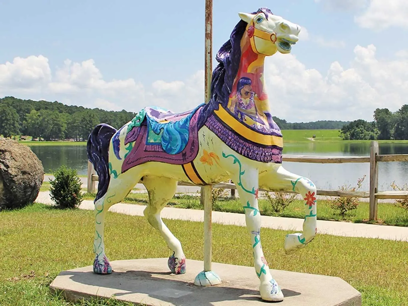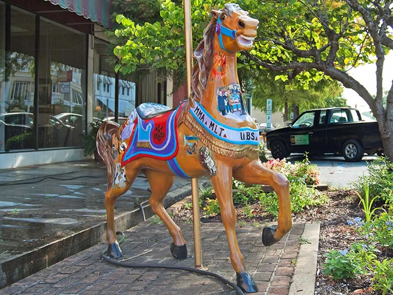 Around Town Carousels Abound is a public art project featuring over 60 life-size carousel horse sculptures placed throughout the city and surrounding areas. Each horse is uniquely designed and painted by a commissioned artist, with the carousel icon representing the historical Dentzel Carousel in Meridian.